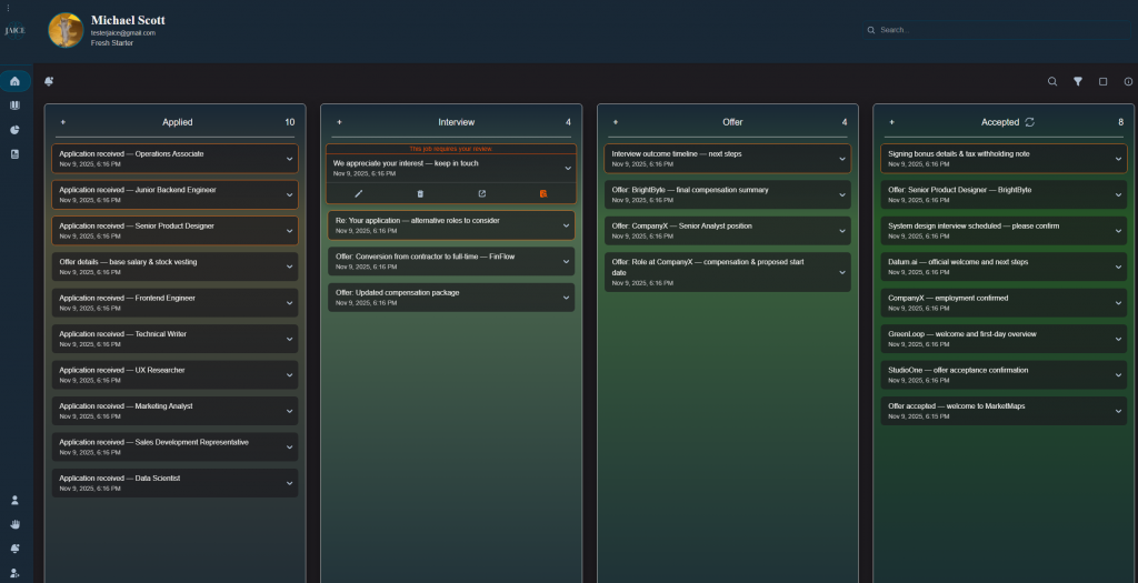 I also added color outlines for some of the emails. Accepted emails now have a green outline, while rejected ones have a red outline, giving users an easy way to scan their status at a glance. Since there was no good spot for rejected emails before, I built a toggle button at the top of the Accepted column. This button lets users flip the column view between Accepted and Rejected emails. It keeps the interface clean and avoids cluttering the dashboard with too many columns.